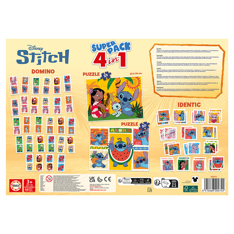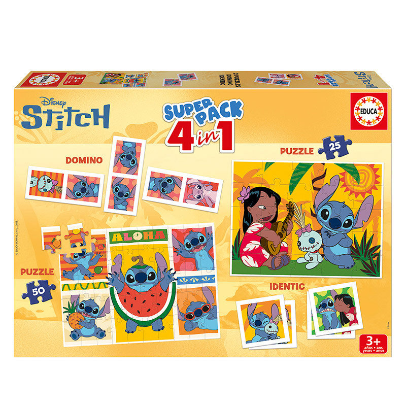 Superpack es una nueva fuente de diversión para los más pequeños a partir de 3 años. Una inmejorable combinación entre juego y educación con la garantía de calidad de Educa®. Este nuevo Superpack contiene 1 puzzle de 25 piezas, 1 puzzle de 50 piezas, 1 Identic memo game de 28 cartas y 1 dominó con 28 fichas. Cuatro juegos en uno que harán las delicias de los más pequeños mientras aprenden divirtiéndose. ©Disney
