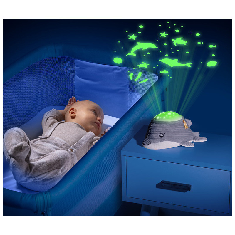 Proyector de mesilla con proyecciones temáticas del mar, que reproduce sonidos blancos del océano y música clásica.Dos modos de uso: luces con melodías o solo luces.Proyecciones de luz: 30 minutos de proyecciones con temática marina en 7 colores que cambian automáticamente.Sonidos y música: 30 minutos de sonidos blancos del océano (olas, aves marinas) y música clásica (Mozart, Couperin), con 2 niveles de volumen seleccionables.Punto de interacción: la parte de plástico blando del delfín.Lavable a máquina, gracias al módulo electrónico extraíble.