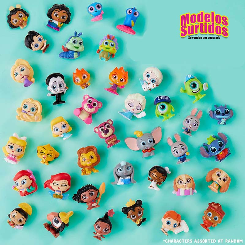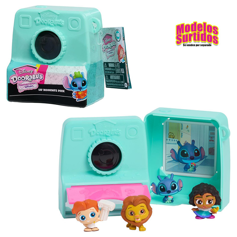 Detrás de cada puerta se esconde una sorpresa con los Disney Doorables’ Lil’ Moments Collection Peek. Para sacar de la caja las figuras y una foto de coleccionista, abre la puerta de la cámara. Saca una tira de 4 bolsas conectadas. Cada tira contiene 2 figuras especiales Doorables en 1 de 2 tamaños, ambas con el estilo característico de Doorables y los ojos de brillante purpurina. Las figuras de 3,8 cm representan a personajes clásicos que los niños conocen y adoran, como Stitch de Disney. Todas las figuras grandes tienen un punto de articulación para adoptar poses dinámicas. Las figuras más pequeñas, los "momentos", de 1,7 cm, permiten echar un vistazo al pasado. Por ejemplo, encuentra a Disney Lady como un dulce cachorro. Después de haberlo encontrado, abre la cápsula de cámara para crear un expositor único. Apila varias cápsulas para crear grandes dioramas. Busca 20 parejas diferentes para recordar cuando los personajes Disney favoritos eran más jóvenes.