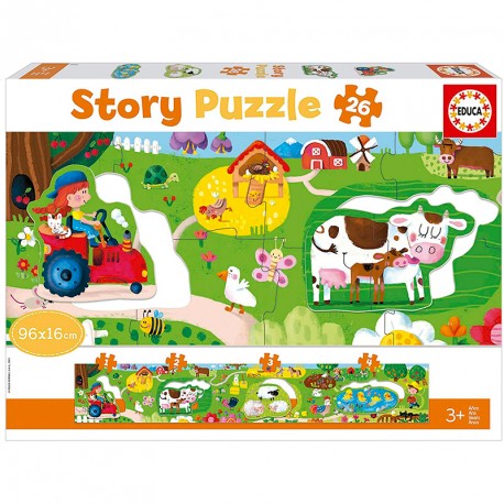 Puzzle panorámico de 26 piezas. Contiene partes extraíbles de 1 a 4 piezas para aprender los números del 1 al 4. La cantidad de piezas está relacionada con el número de figuras incluidas en cada una. Temática: la granja. Tamaño aproximado del puzzle montado: 96 x 16 cm.