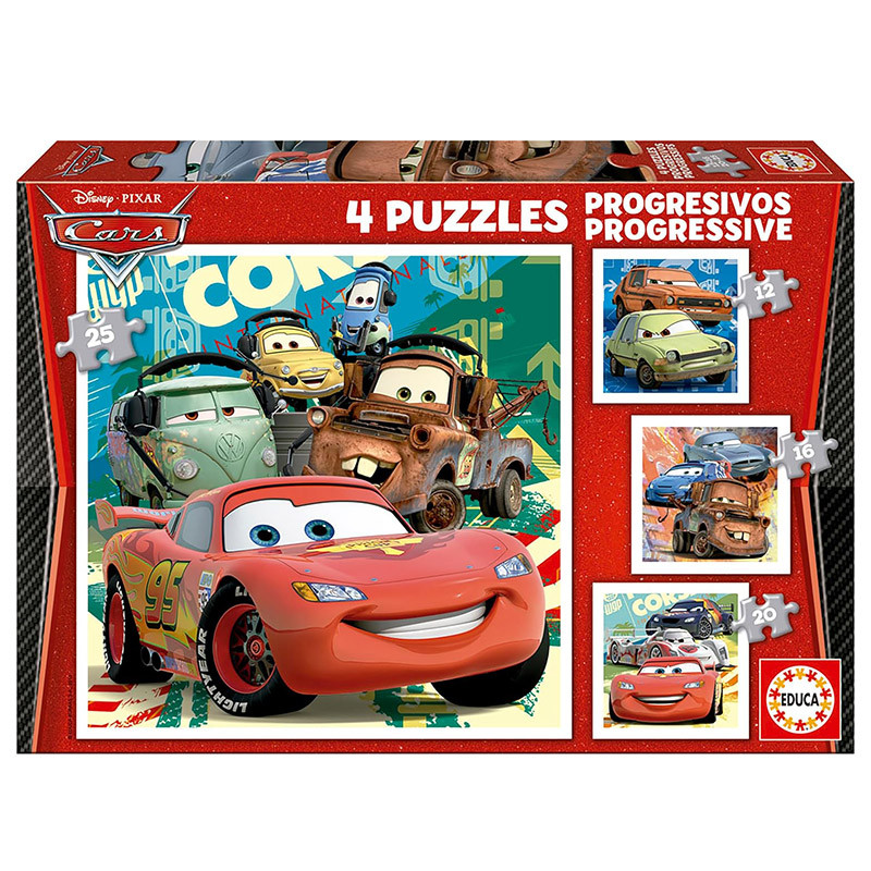 Cada caja contiene 4 puzzles con diferente número de piezas (entre 12 y 25), para que niños y niñas se atrevan con distintos niveles de dificultad a medida que crecen y ganan práctica en el montaje. Tamaño de cada puzzle montado: 16 x 16 cm. rayo McQueen vuelve con nuevas carreras alrededor del mundo, nuevos personajes y más avenura y emoción que nunca. © Disney / Pixar