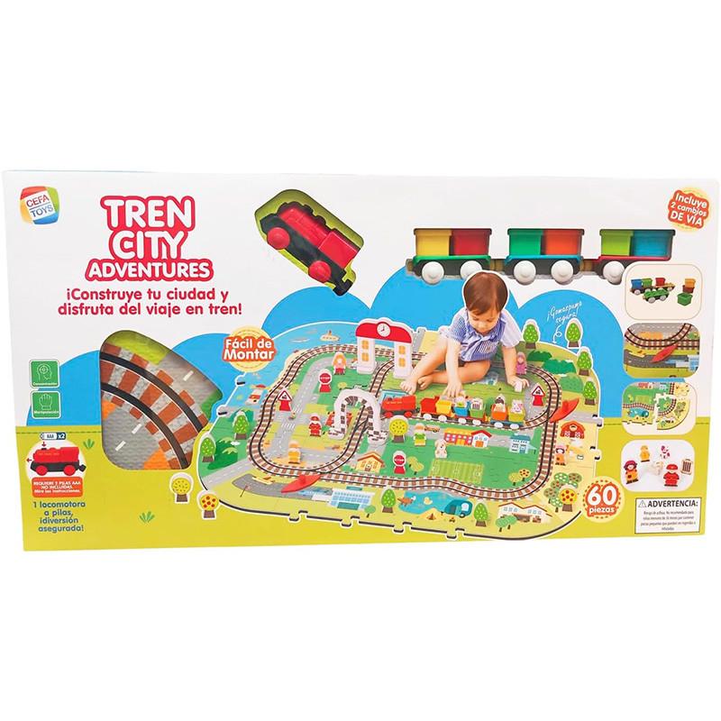 ¡Construye tu propia ciudad y disfruta de un emocionante viaje en tren con el TREN CITY ADVENTURES de Cefa Toys! Este completo set infantil incluye 60 piezas diseñadas para estimular la creatividad y el juego simbólico de los más pequeños. Con 12 alfombrillas encajables que forman una colorida ciudad, 34 accesorios de gomaespuma, 2 cambios de vía, 3 vagones con 6 cajones y una locomotora motorizada, los niños y niñas a partir de 3 años podrán crear su propio mundo ferroviario de manera fácil y segura.La locomotora funciona con 2 pilas AAA (no incluidas) y se desplaza por las vías integradas en la alfombra, haciendo que el juego sea más realista e interactivo. Gracias a su montaje sencillo tipo puzzle, los peques pueden armar su ciudad en pocos minutos y cambiar su diseño cada