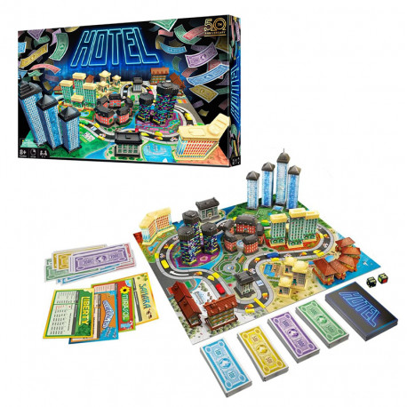 Desarrolla hoteles de lujo por todo el mundo, ¡y haz que tus rivales paguen por alojarse en ellos! Cuanto más construyas, ¡más dinero tendrás! ¿Tienes lo necesario para hacerte con todo? ¿O perderás toda tu fortuna? CONTENIDO 1 tablero, 30 Edificios, 8 Zonas de recreo, 30 Entradas, 8 Títulos de propiedad, 100 billetes, 4 Coches, 2 dados, 1 reglamento.