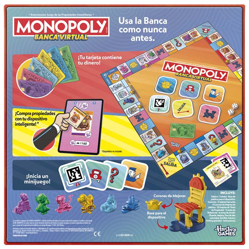 ¡El juego Monopoly Banca Virtual es el primer juego Monopoly asistido por una aplicación para facilitar la gestión de las finanzas, y que además incluye minijuegos y mucho más! En este fácil juego de mesa infantil, los jugadores disfrutan del juego Monopoly clásico en el tablero, pero la aplicación es la banca y el banquero a la vez. ¡Sin dinero y sin tener que contar! Para empezar, descarga la aplicación Monopoly Banca Virtual (Descárgala gratis. Pueden aplicarse tarifas de datos y compras integradas) y coloca un dispositivo inteligente en el soporte incluido. (Dispositivo no incluido). Elige una tarjeta bancaria y su peón correspondiente y recorre el tablero de extravagantes propiedades. Escanea los Títulos de Propiedad y, después, compra, subasta y cobra el alquiler con la aplicación. ¡Los jugadores pueden incluso iniciar minijuegos para recibir premios! Con partidas más rápidas que el juego Monopoly clásico, es ideal para jugar a diario y para las noches de juegos en familia. Los juegos asistidos por aplicaciones y los juegos familiares son excelentes regalos para los niños y las niñas que adoran el juego Monopoly Banca Electrónica y otros juegos Monopoly. Edad recomendada: A partir de 8 años Los nombres y logotipos de Hasbro y Monopoly, el diseño distintivo del tablero, las cuatro casillas de las esquinas, el nombre y el personaje de Mr. Monopoly, así como cada uno de los elementos distintivos del tablero y piezas de juego, son marcas registradas de Hasbro, Inc. para su juego de las operaciones inmobiliarias y equipo del juego.