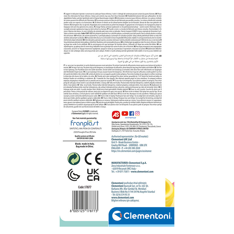 La bolsa transparente contiene 20 bloques de colores ultrasuaves Baby Clemmy diseñados para que los niños de entre 6 y 18 meses jueguen de forma segura. Los suaves bloques Baby Clemmy son ideales para la exploración sensorial con una serie de colores brillantes que estimulan la percepción visual, despiertan la atención y perfeccionan la capacidad de observación. Fabricados con material no tóxico, lavable y perfumado, son fáciles de agarrar y apilar y estimulan la imaginación y la creatividad del niño. Todos los bloques Clemmy se fabrican en Italia. Seguro y lavable