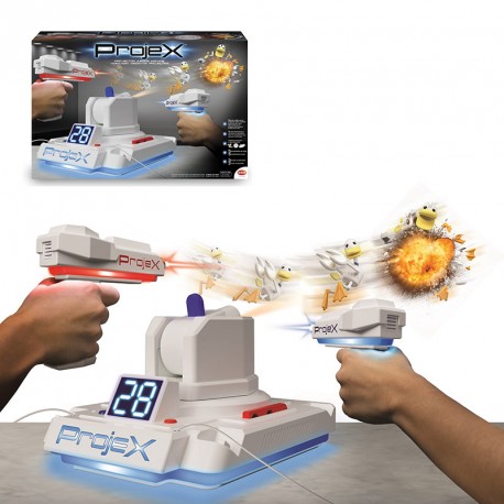 Con el proyector de juegos ProjeX, ¡transforma el salón de tu casa en una sala Arcade! Diversión asegurada con 5 juegos diferentes y 3 niveles de dificultad, ¡destruye los diferentes tipos de blancos, ya sean dianas, patos u ovnis! No necesita pantalla de televisión ni sensores. Tan solo proyecta en cualquier pared de color claro. ¡La diversión está asegurada!