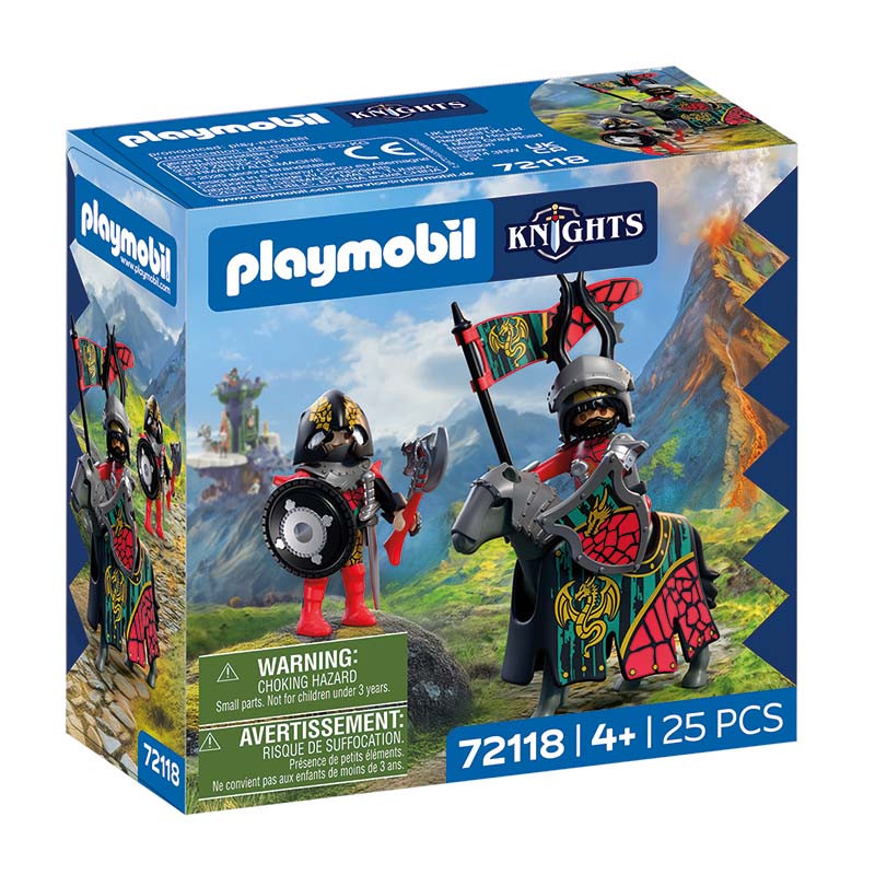 El cabecilla de los Caballeros del Dragón se dirige al interior del reino, a caballo y con la bandera de su orden en la mano. A su lado lucha un fiel compañero con un pesada hacha, listo para defender con todas sus fuerzas el estandarte de su jefe.