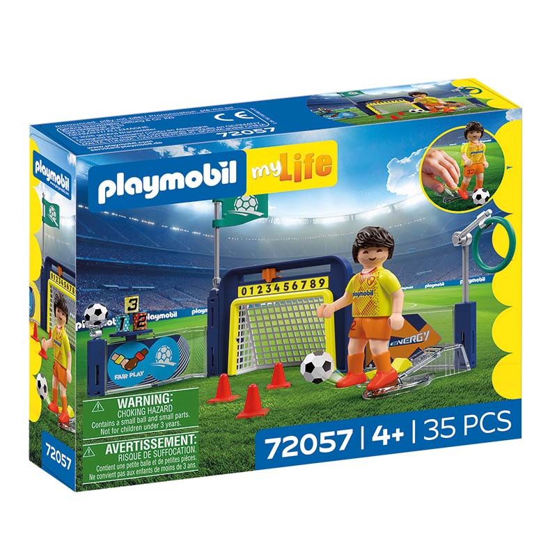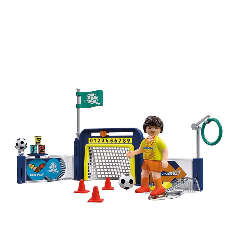 Apuntar, pasar o regatear: en el centro de entrenamiento de PLAYMOBIL, pequeños y pequeñas aficionadas al fútbol pueden demostrar su precisión de disparo y su control del balón. Tres latas esperan a ser derribadas de la mesa, el anillo regulable pone a prueba el objetivo en el disparo a puerta y una pelota en un estante requiere tirar con la máxima precisión. Con los conos, el entrenamiento de regate se convierte en un desafío emocionante hasta llegar a la portería, ¡como los profesionales! Por supuesto, el jugador de PLAYMOBIL puede también golpear el balón perfectamente: basta con tirar de la pierna hacia atrás, soltarla y disparar. Los goles marcados se pueden contar con el cursor del marcador situado encima de la portería. Con la hoja de pegatinas adjunta, los niños y niñas pueden dar a su futbolista un número de dorsal propio.