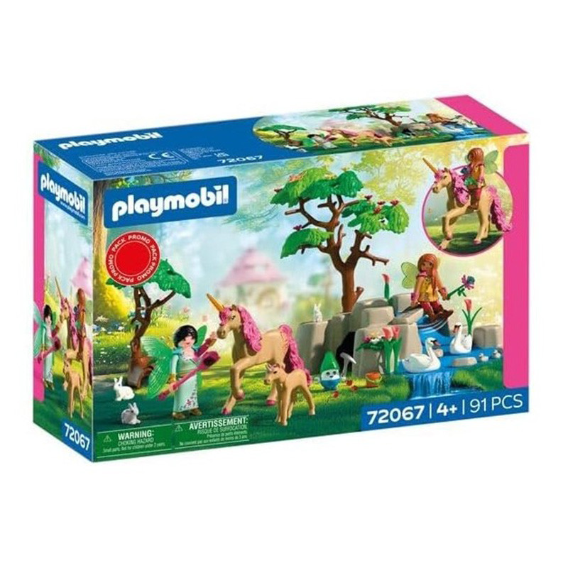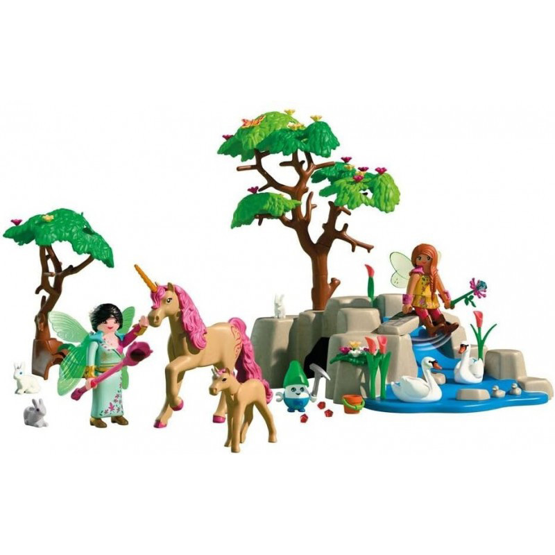 Dos hadas visitan a su buen amigo el jubiloso, y juntos emprenden una excursión a la naturaleza junto a un unicornio y a su potrillo. ¡Las hadas incluso pueden montarse a lomos del unicornio! En el camino, el alegre grupo se encuentra con lindos animalitos del bosque como conejos y mariposas, mientras que un cisne dibuja tranquilamente círculos en el agua. Un puente natural atraviesa el precioso terreno. Debajo del paisaje se esconde la cueva del jubiloso, donde este recoge brillantes piedras preciosas para regalar a las hadas como recuerdo de la excursión.
