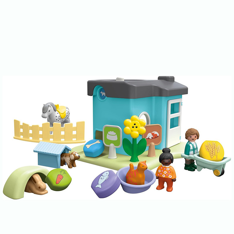 Todos los amantes de los animales pueden aprender a cuidar de sus mascotas favoritas. Las cuatro mascotas necesitan comida y un lugar donde dormir. Hay un divertido comedero integrado en el techo de la casa, para que niños y niñas puedan aprender jugando cuáles son las comidas favoritas de los animales.