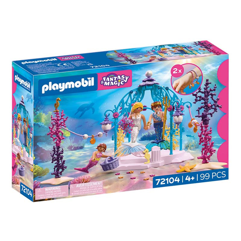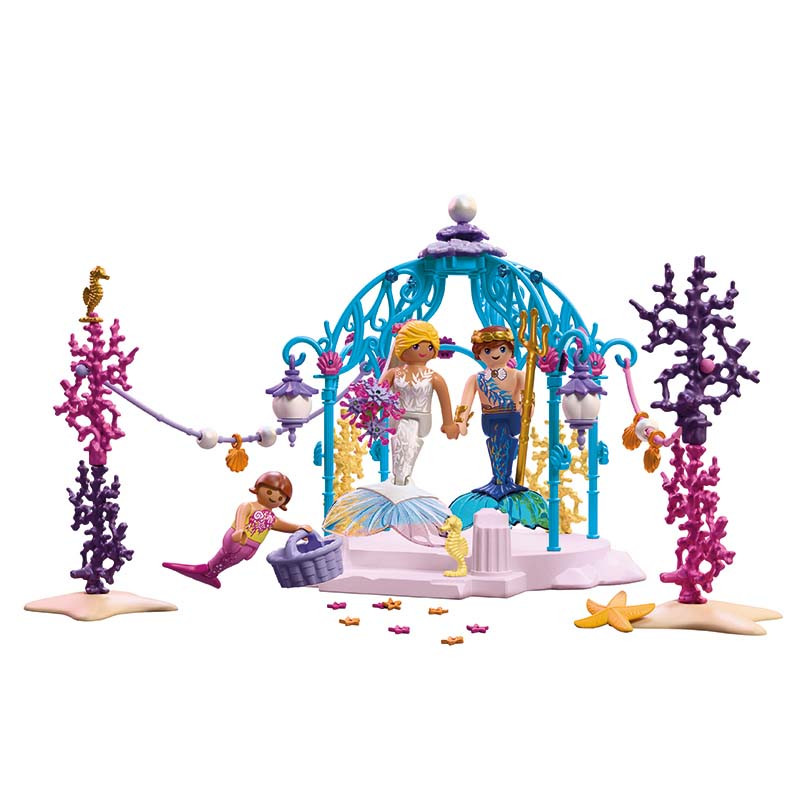 ¡Un día especial en el reino de las sirenas! En el templete, la sirena y el marinero se dan el «sí, quiero» en una boda submarina, mientras la niña sirena esparce flores sobre la arena. Dos pequeños caballitos de mar y una estrella de mar curiosa asisten al evento como invitados. Las farolas situadas alrededor del templete comienzan a brillar mágicamente en la oscuridad, y las coloridas guirnaldas con colgantes se pueden usar incluso como pulseras.
