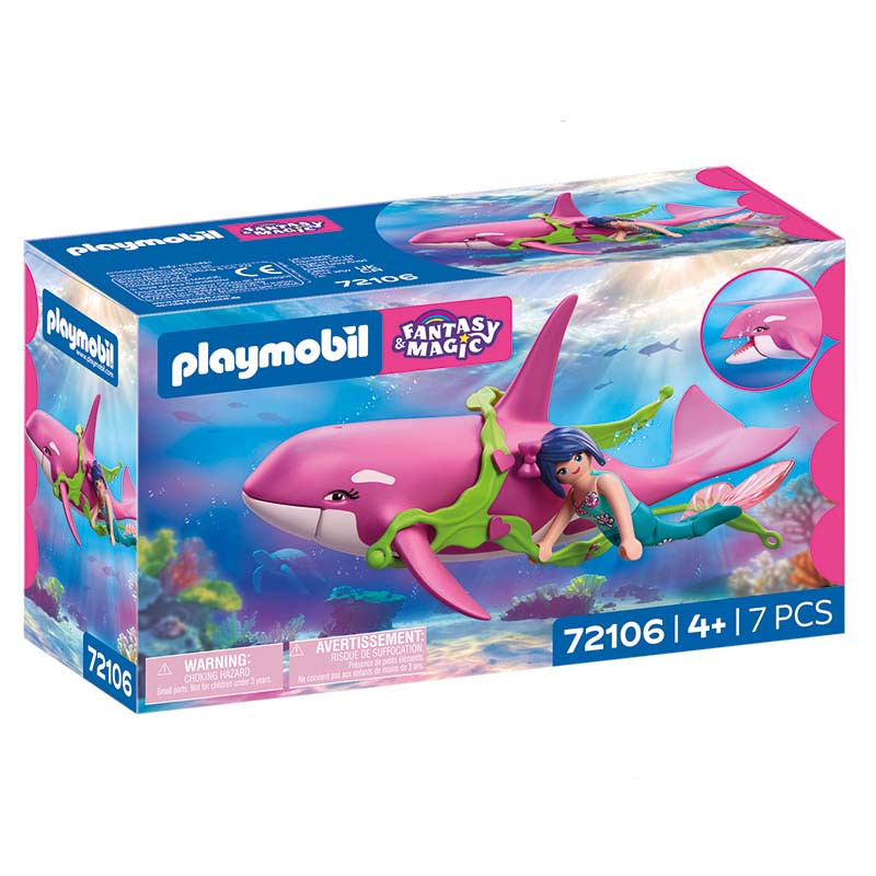 La imponente orca se desliza a través de las aguas con la sirena a su lado. El alga marina no solo sirve de práctico agarradero para la sirena, sino que también puede utilizarse como pulsera. Con los bonitos ornamentos intercambiables, el alga se puede decorar a placer e incluso puede combinarse con los adornos para el cabello de la sirena. La orca puede nadar tanto tumbada como erguida en el agua, lo que la convierte en una fiel compañera en cualquier viaje submarino.