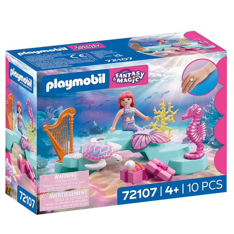 Al acudir a la gran boda submarina, la sirena no solo lleva una melodía para tocar en el arpa, sino también un regalo especial: en la bonita caja que esconde un anillo brillante con perla incluida, adecuado para manos pequeñas y perfecto para jugar y soñar. En su camino a la celebración, a la sirena le acompaña una simpática tortuga y un gran caballito de mar.
