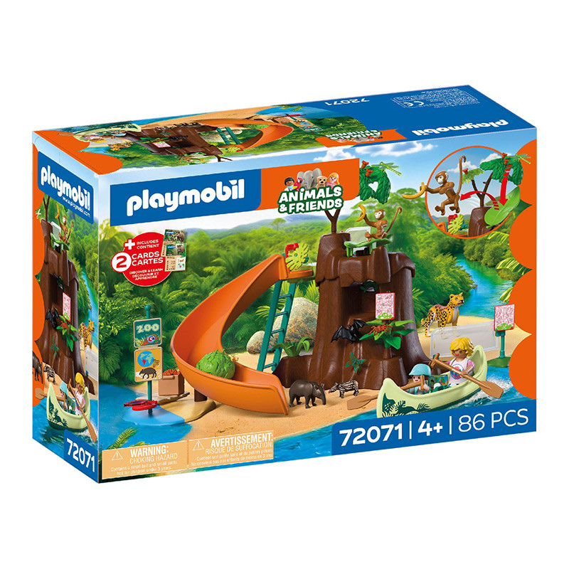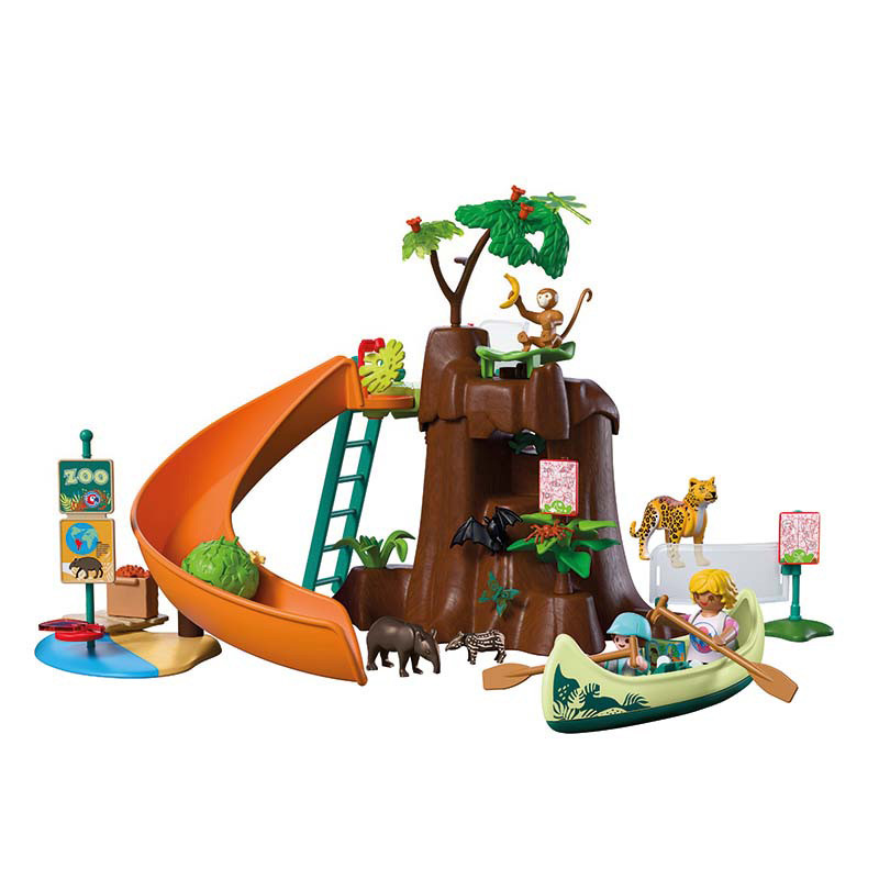 Con la canoa, madre e hijo llegan al embarcadero junto al impresionante árbol de la selva, el centro de la extensa zona del zoológico sudamericano. Desde el principio, un elemento especial causa asombro: una hoja de honda hace que el mono se mueva rápidamente por el aire. Justo al lado, unas bolas de comida ruedan por un tobogán hasta la familia de tapires, que espera abajo en las aguas poco profundas. Entonces comienza la expedición: agarra el equipo, sube por la escalera y descubre la vida salvaje desde la plataforma. Dos cuevas transitables ofrecen refugio para murciélagos; alrededor del árbol hay plantas fluorescentes, mariposas y libélulas esperando ser descubiertas: una aventura viva en medio de la selva.