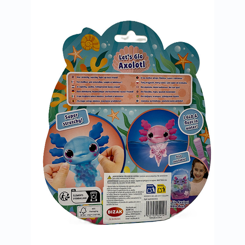 Axolote es tu mascota elástica, blandita y luminosa. Puedes estrujarlo, estirarlo, y al sumergirlo en el agua su barriga se ilumina, parpadeando, haciendo el efecto de su corazón. Tu simpático amigo acuático es súper blandito, con divertidas branquias elásticas y una irresistible textura blandita. Flota en vertical en el agua, haciendo que siempre tenga el efecto de estar nadando.