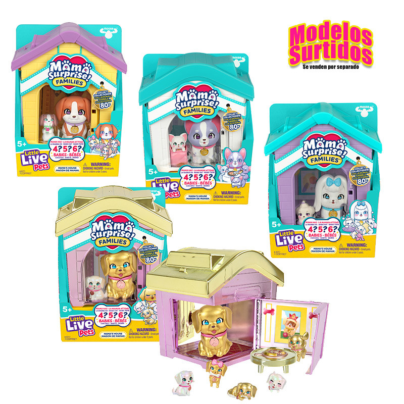 Diviértete jugando con las Familias sorpresa de mamá de Little Live Pets, unos miniperritos coleccionables de lo más adorables. ¡Hay más de 80 mamás y cachorros para coleccionar en la serie 1! ¡Empieza una familia con el pack La casa de mamá de las Familias sorpresa de Little Live Pets! ¡Mamá tiene 4, 5 o 6 bebés como por arte de magia! ¿Cuántos encontrarás? Fija la puerta a la casa y cuida de mamá limpiándole las mejillas con un paño húmedo. Cuando se le pongan las mejillas sonrosadas, ¡estará lista para tener a sus bebés! Colócala con cuidado en la casa, cierra la puerta y luego ábrela para descubrir un bebé. ¡Abre y cierra la puerta una y otra vez hasta descubrir 4, 5 o 6 bebés! Hay siete familias de cachorros para descubrir en el pack La casa de mamá: beagle, bulldog francés, husky, caniche, spaniel y maltés, ¡además de una familia golden retriever de edición limitada! Colecciona las siete casas, ¡cada una con su propia temática especial! La casa de mamá se abre y se transforma en un pequeño set de juego con suficiente espacio para que juegue toda la familia de perritos. Descubre un accesorio sorpresa para pasarlo aún mejor con tus perritos. ¡Las Familias sorpresa de mamá te llenarán el corazón de ternura!