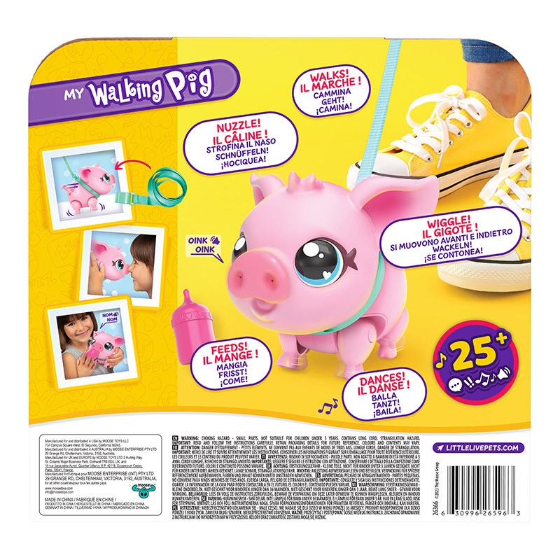 Con sus más de 25 sonidos y reacciones, Piggly se mueve y hace ruiditos como una cerdita bebé de verdad. Dale el biberón y abrázala para ver cómo reacciona al contacto. ¡Levántala y acércale la nariz al hocico para que te dé un besito! Piggly hace un montón de sonidos graciosos y adorables: ¡gruñe, come, se ríe, estornuda y puede que hasta se le escape un pedete!
