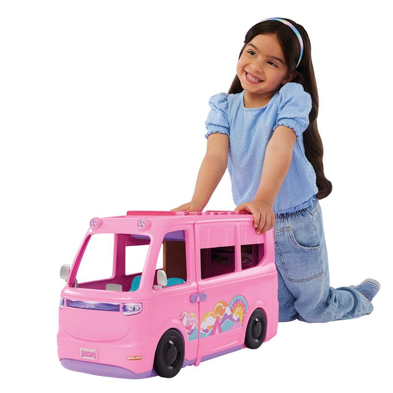 ¡Disfruta de un sinfín de aventuras al aire libre con el conjunto de juego Súper Caravana DreamCamper de Barbie, que incluye siete zonas de juego y más de 60 accesorios! Empuja la caravana para empezar a jugar y despliégala para que aparezca una tienda de campaña en el techo, una sala de estar, un comedor y un cuarto de baño. La diversión está asegurada: pesca en el estanque, relájate en el columpio y hazle un hueco al adorable cachorrito. Cuando llegue la hora de la cena, utiliza la masa incluida para preparar unas hamburguesas para la muñeca Barbie y sus amigos (se venden por separado), y diviértete cocinándolas a la parrilla en la barbacoa: ¡mira cómo cambia de color la comida al 'cocinarse'! El conjunto de juego Súper Caravana DreamCamper de Barbie es ideal para imaginar miles de historias repletas de diversión, lo que lo convierte en un gran regalo para niños y niñas a partir de 3 años, ¡especialmente para los amantes de la naturaleza! Muñecas no incluidas. Los colores y la decoración pueden variar.
