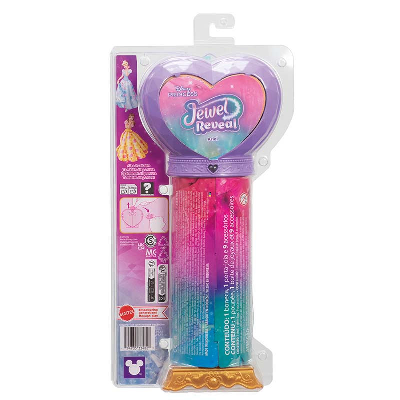 Descubre el mundo encantado de Disney Princesas con la muñeca Ariel y los accesorios sorpresa de Jewel Reveal. La diversión comienza en el momento en que las niñas y los niños abren la joya en forma de corazón de la parte superior de la caja, que muestra la preciosa muñeca de moda de Ariel y accesorios sorpresa inspirados en la popular película “La Sirenita” de Disney. Las niñas y los niños podrán adornar la muñeca con joyas y luego fijar el corazón a la base para crear un joyero para guardar accesorios. ¡Perfecto para los fans de Disney a los que les encanta jugar a juegos relacionados con la moda y divertirse contando historias! La muñeca no puede tenerse en pie por sí sola. Los colores y la decoración pueden variar.