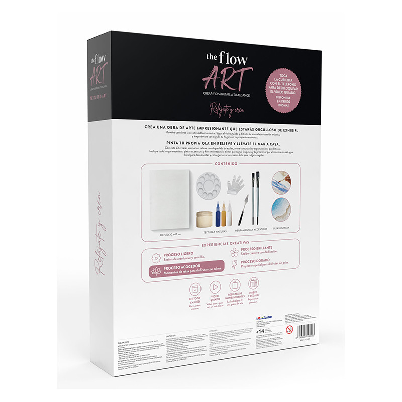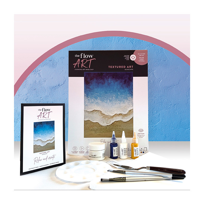 Crea arte impresionante que expondrás con orgullo. Mar: LA EXPERIENCIA TÁCTILEste kit se centra en el volumen. Utiliza pastas de relieve para recrear la espuma de las olas y la profundidad del océano. Perfecto para amantes del mar. Incluye lienzo, textura y pinturas, herramientas, accesorios y guía ilustrada. Flow Art transforma la creatividad en bienestar. Sigue el vídeo guiado y disfruta de una sesión artística relajante, para luego decorar tu hogar con tu propia obra maestra.