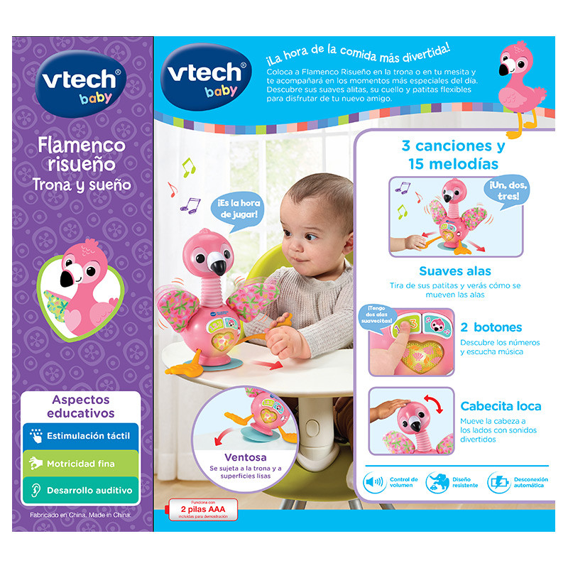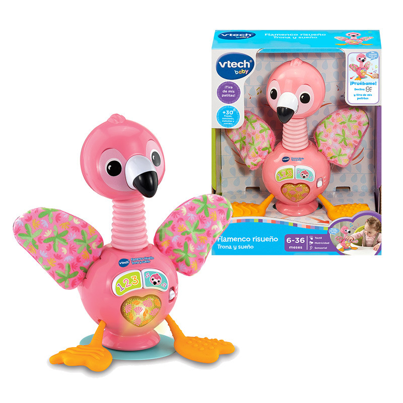 Flamenco rosa interactivo que acompaña al bebé a la hora de comer. Juguete para la trona para bebés +6 meses.