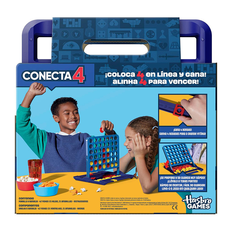 ¡Coloca 4 en línea y gana con el juego Conecta 4! Esta edición del popular juego para 2 jugadores combina el juego clásico con nuevas características, como el estuche todo en uno, la bandeja de almacenamiento y el marcador de puntos. Para jugar, cada jugador suelta sus discos en la parrilla e intenta colocar 4 discos de su color en línea. Piensa estratégicamente y bloquea a tu oponente para colocar el disco del triunfo. El primero en ganar 4 rondas será el campeón, y ahora los jugadores podrán hacer el seguimiento de las victorias con los marcadores de puntos integrados. Esta edición portátil está diseñada para guardarla con facilidad y para llevarla a todas partes. ¡Los discos se guardan dentro de la unidad de juego con facilidad, la cual se convierte en un estuche con asa! El juego Conecta 4 añade mucha diversión a las fiestas de cumpleaños de los niños, reuniones de amigos y familiares y en muchas otras ocasiones. Los juegos familiares y los juegos de mesa clásicos también son perfectos como regalos para los niños CONECTA 4 y HASBRO GAMES y todas las marcas y logotipos relacionados son marcas registradas de Hasbro, Inc.
