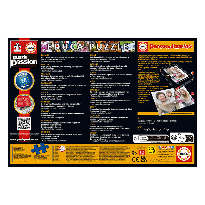 Educa® te ofrece la colección de Puzzles Adultos más completa del mercado, con tamaños desde las 500 a las 42000 piezas y con las mejores imágenes y los personajes más divertidos. Número de piezas: 500. Tamaño aproximado del puzzle montado: 48 x 34 cm. En todos los puzzles desde 500 hasta 2.000 piezas (inclusive) regalamos la cola especial FIX PUZZLE® para poder colgar el puzzle una vez finalizado el montaje.
