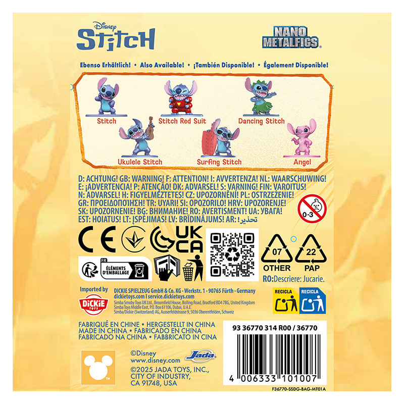 Descubre la diversión de coleccionar con los sobres sorpresa de nano figuras Stitch de Jada Toys. Cada figura está fabricada en metal de 4 cm, pintada a todo color y presentada en un sobre cerrado sorpresa. La colección está formada por 6 modelos distintos: Stitch bailando, Stitch con traje espacial, Stitch hawaiano, Stitch con ukelele, Stitch con tabla de surf y la figura de Angel. Se venden de forma aleatoria, lo que convierte cada apertura en una experiencia emocionante y perfecta para intercambio entre coleccionistas. **Jada Toys**, fabricante líder de figuras y coches coleccionables de películas y franquicias de Hollywood, combina tradición y detalle en cada creación. Estas figuras de Stitch no solo son juguetes para niños desde los 3 años, sino también piezas de colección para fans de Disney que disfrutan reuniendo personajes únicos y llenos de encanto.